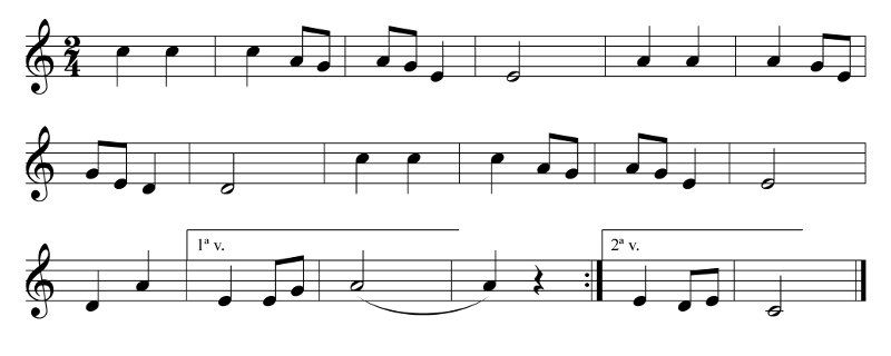 Al següent exemple, la melodia principal està interpretada per la veu, i en 2n pla hi ha l'acompanyament del piano: